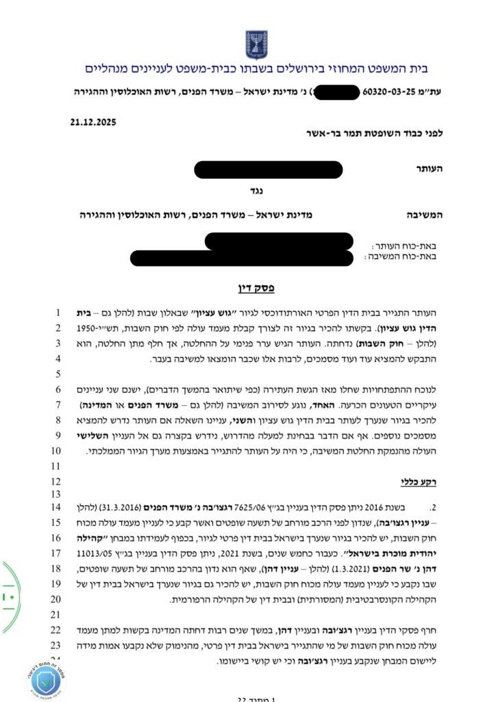 בהחלטת בית המשפט המחוזי בירושלים מיום 21.12.2025 נאמר בקול ברור ושם גבול ברור לגרירת רגליים ביורוקרטית: בתיק על הכרה בגיור אורתודוקסי פרטי שנערך בישראל, בית המשפט הבהיר שהמשרד אינו רשאי להפוך את ההליך למרתון אינסופי — לשמור בן-אדם במעמד "ממתין" שנים על גבי שנים בלי החלטה, לדרוש שוב ושוב מסמכים, כולל כאלה שכבר הוגשו.